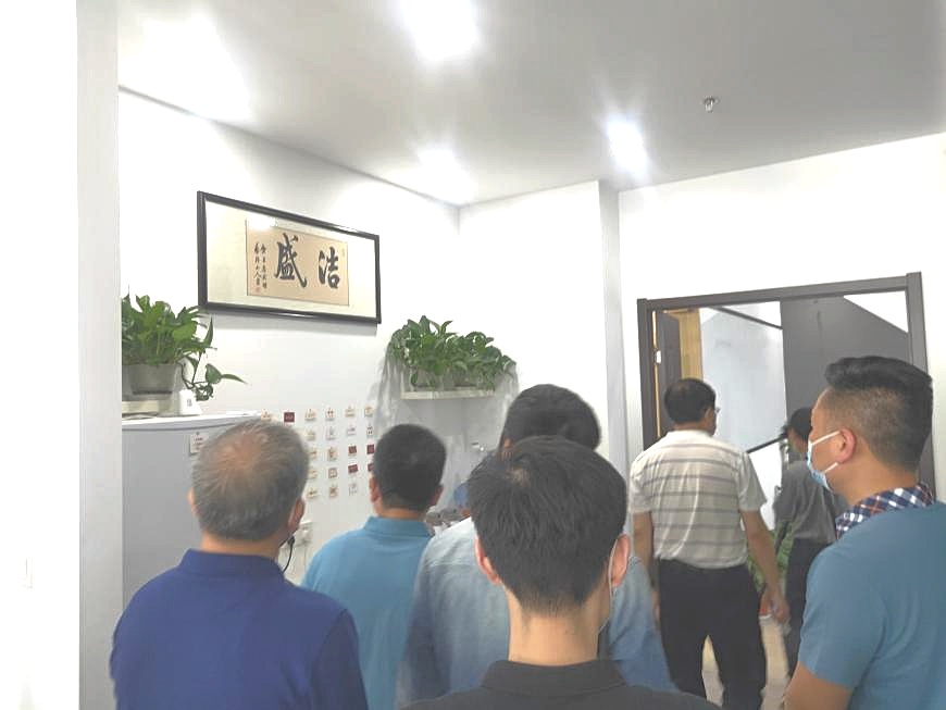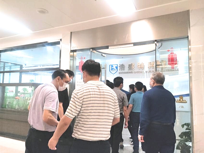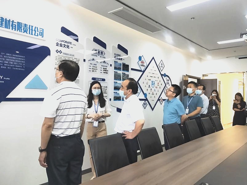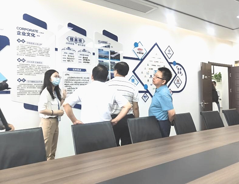 驻足会议室一侧,视察组一行领导结合时博在线(中国)唯一官方网站墙与现场讲解,初步了解公司整体运营、市场布局、战略客户与工程案例。